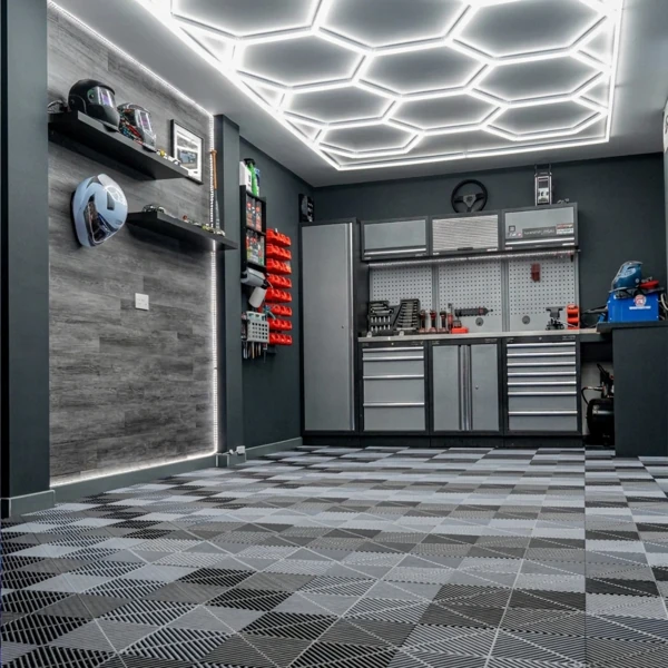 Transform your garage space with Interlocking Checkered PVC Garage Floor Tiles, offering a modern look combined with practical performance. The interlocking system ensures quick installation without adhesives, while the checkered pattern adds visual appeal.